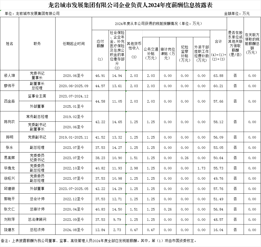 龍巖城市發(fā)展集團(tuán)有限公司及所屬企業(yè)負(fù)責(zé)人2024年度薪酬、2022-2024年任期激勵(lì)收入信息披露表